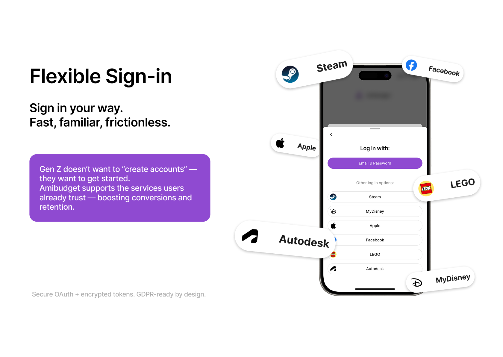 Amibudget changes this approach with Flexible Sign-in — a modern authentication system that lets users log in with the platforms they use every day: